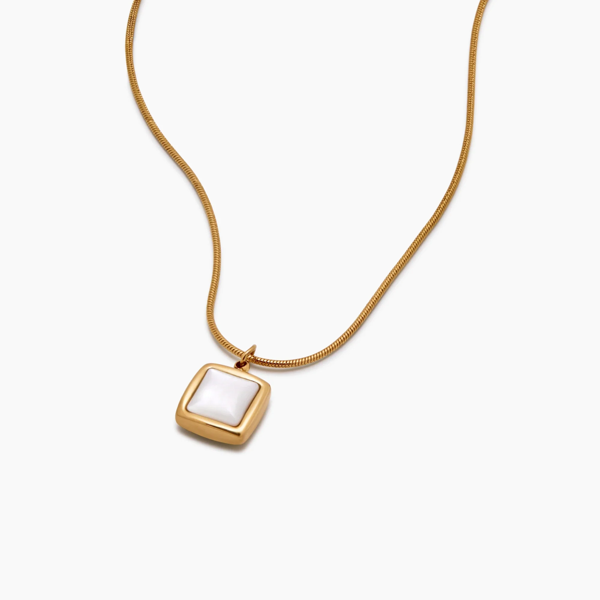 The Mother Of Pearl Square Pendant Necklace features a luminous square mother of pearl stone elegantly framed in premium 18K gold plated stainless steel on a delicate chain. This waterproof, tarnish-resistant piece combines geometric precision with the natural iridescence of mother of pearl, creating a versatile statement that maintains its luxurious shine and catches light beautifully through daily wear. Layer this timeless pendant with shorter chain necklaces for a sophisticated, dimensional look that transitions effortlessly from day to evening.